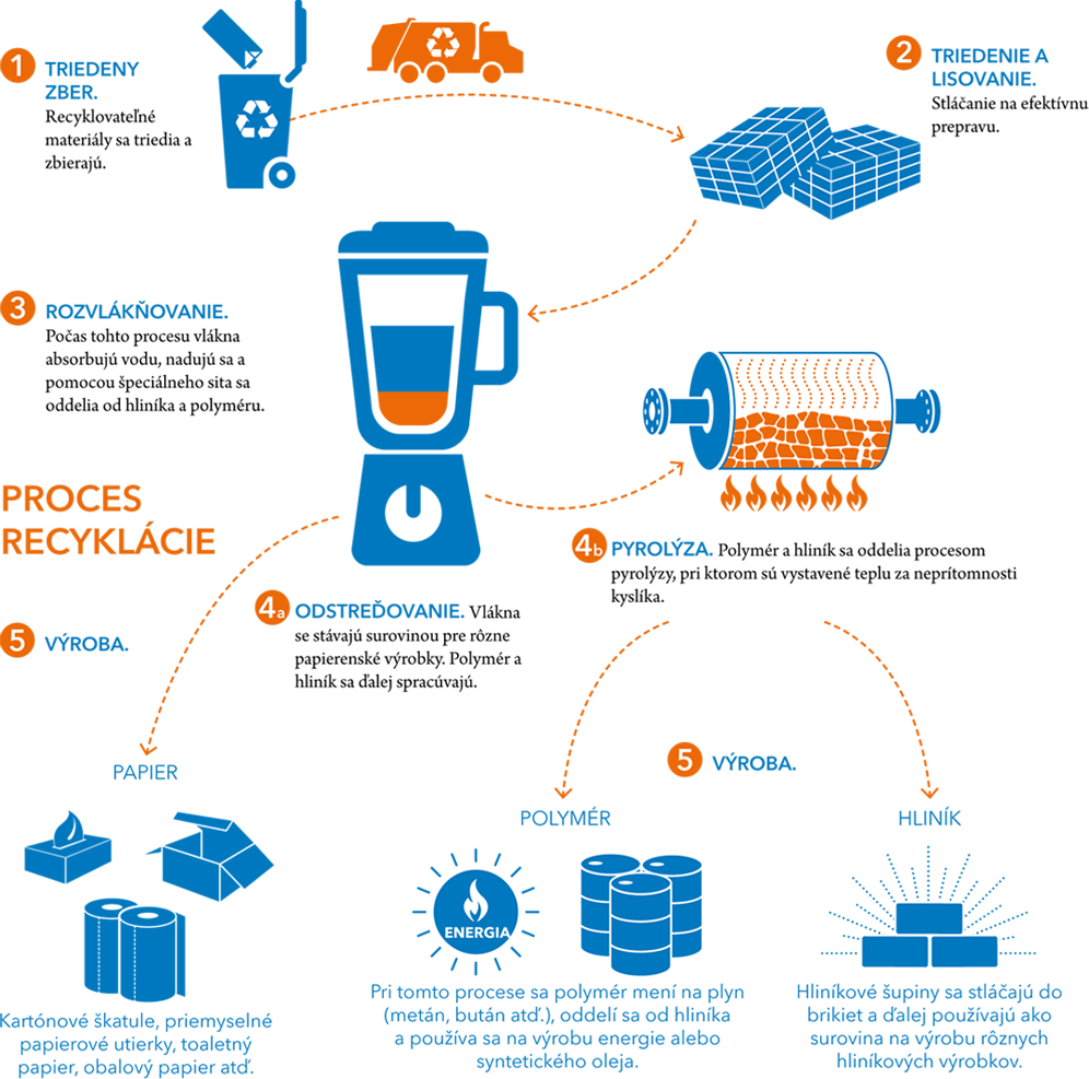 Použité nápojové kartóny sú zdrojom cenných surovín. Všetky vrstvy kartónu, ktorými sú papierové vlákna, polyméry a niekedy aj hliník (v prípade trvanlivého mlieka), možno recyklovať jednoduchými postupmi a tým im dať nový život.